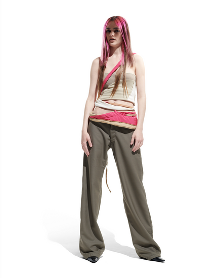 AMIS tailored trousers in khaki. These come with a decorative side pouch made from the same khaki wool. The pink belt is not included.