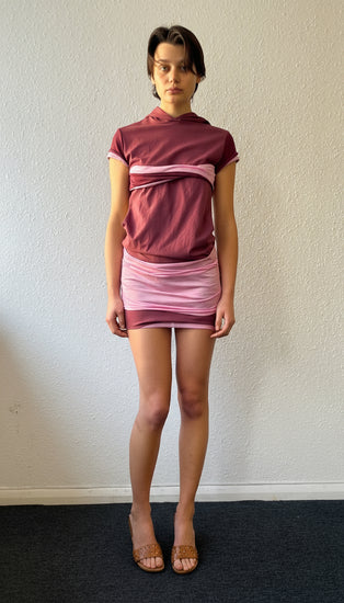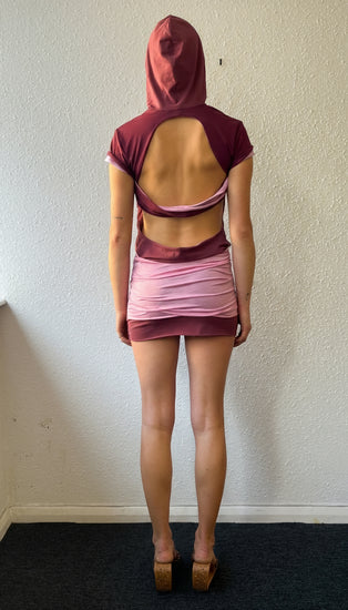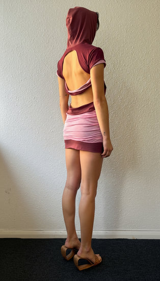 CHARLIE open-back dress with drapes and hood, in BURGUNDY & PINK jersey.