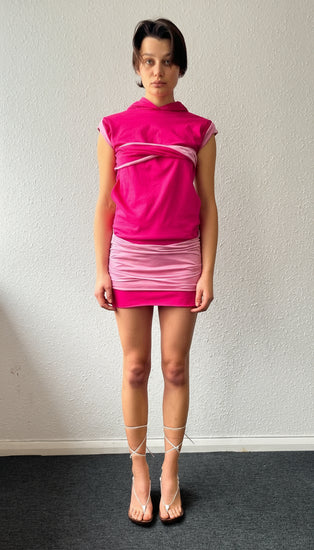 CHARLIE open-back dress with drapes and hood, in HOT PINK & LIGHT PINK jersey.