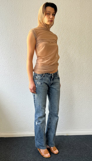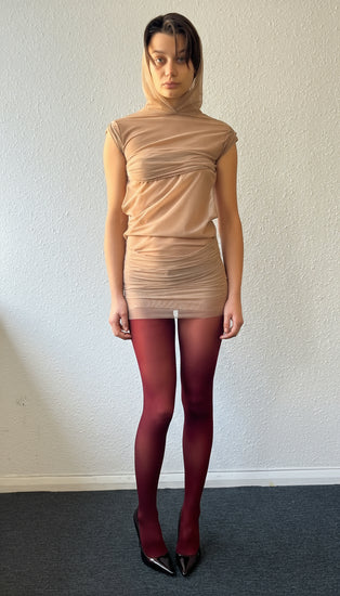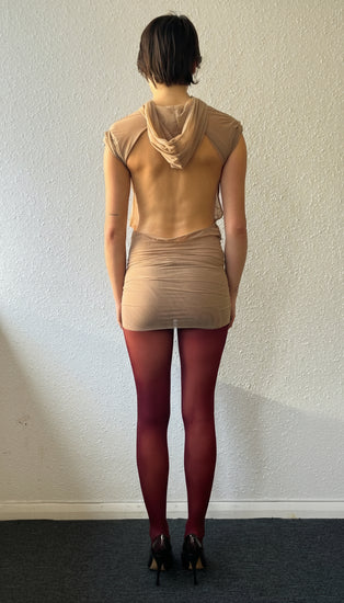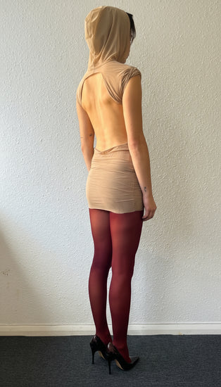 CHARLIE open-back dress with drapes and hood, in NUDE mesh.