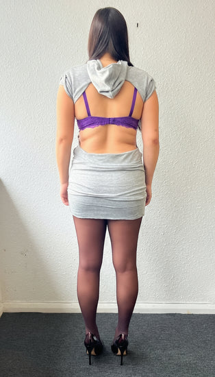 CHARLIE open-back dress with drapes and hood, in GREY fleece-jersey.