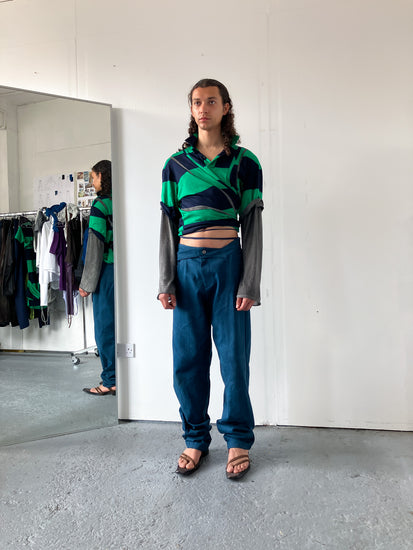 JULES hand-dyed denim paneled trousers in blue.
