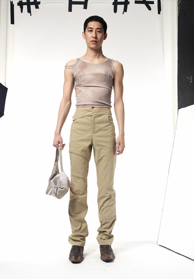 MISCHA technical twill trousers with snake piping detail in beige.
