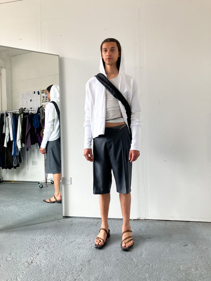 NYCOLA charcoal tailored shorts with V-waistband detail.