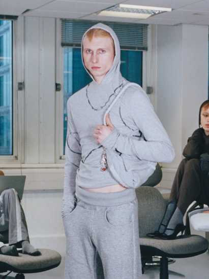 SINISA marl grey jersey longsleeve with hood and screenprint details.